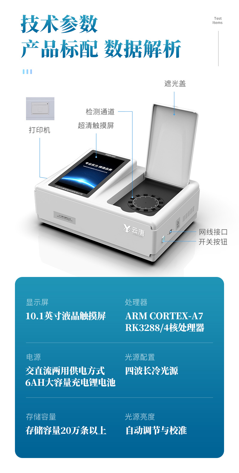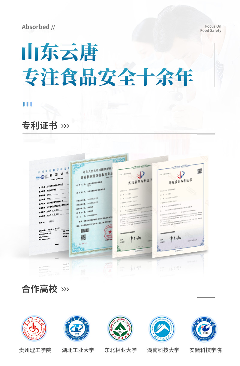 山東云唐智能科技有限公司生產(chǎn)的果蔬肉類檢測儀,采用臺(tái)式一體化設(shè)計(jì),可快速檢測幾十種項(xiàng)目,包含各種蔬菜水果中有機(jī)磷和氨基甲酸酯類農(nóng)藥殘留,病害肉診斷:肉中組胺、揮發(fā)性鹽基氮;各種肉食品中瘦肉精激素類殘留、抗生素、獸藥殘留等現(xiàn)場的定性定量檢測。
